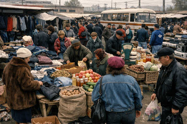 Ринок зустрів її шумом, гавкотом собак і криками зазивал. Валя стояла біля входу, тримаючи в руках маленький розкладний стільчик і пакунок зі шкарпетками та господарським милом, які взяла в борг.