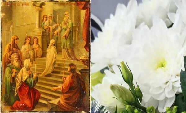 О, всеблаженнішая, Богом дана дочко святих і праведних Богоотців Йоакима і Анни, яка згідно з їхньою обітницею і за велінням Божим приведена була у храм і в домі Божому насаджена та Духом просвічена.