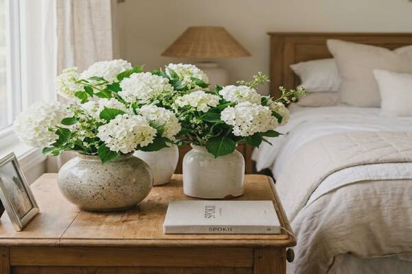 На столі, де раніше стояла порожня кришталева ваза, тепер височіли три великі керамічні горщики. У них розпускалися пишні кущі білих гортензій.